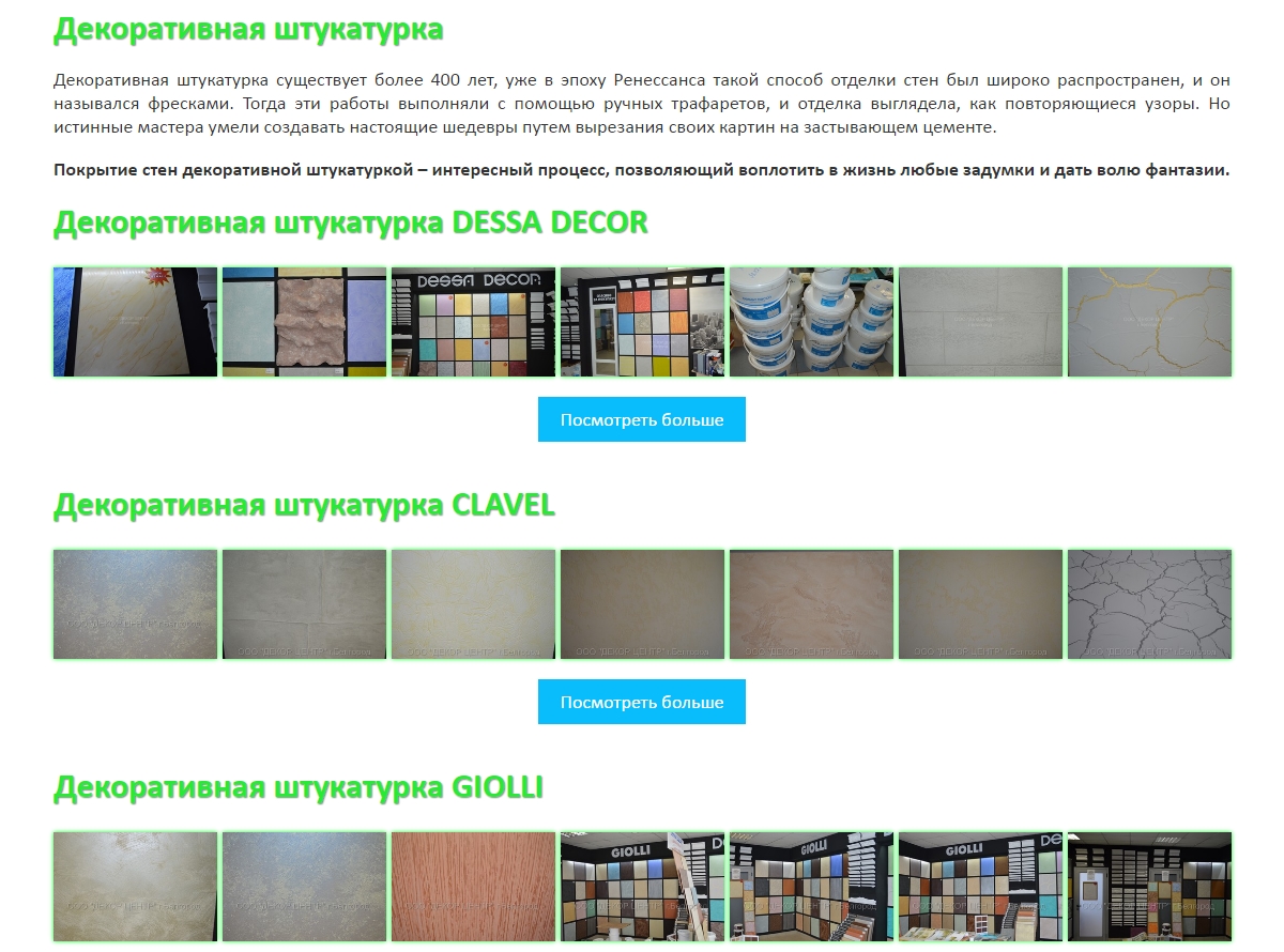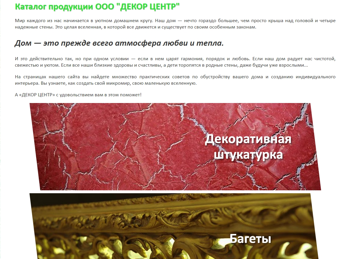 Необходимо было создать сайт для торговой компании, основная сфера деятельности которой - декоративная штукатурка. На сайте присутствует каталог продукции в виде галереи изображений, а также новостная лента компании. Присутствует портфолио и страница с отзывами.