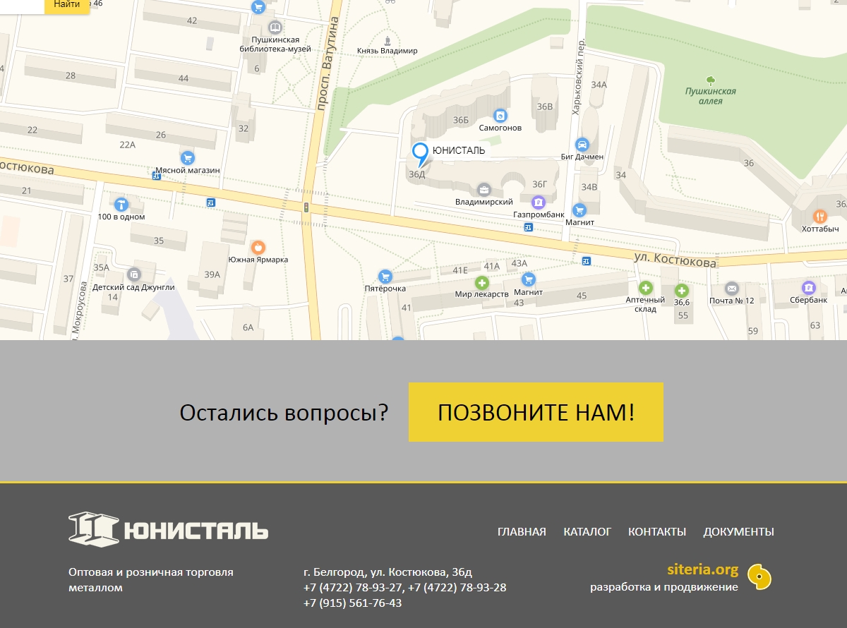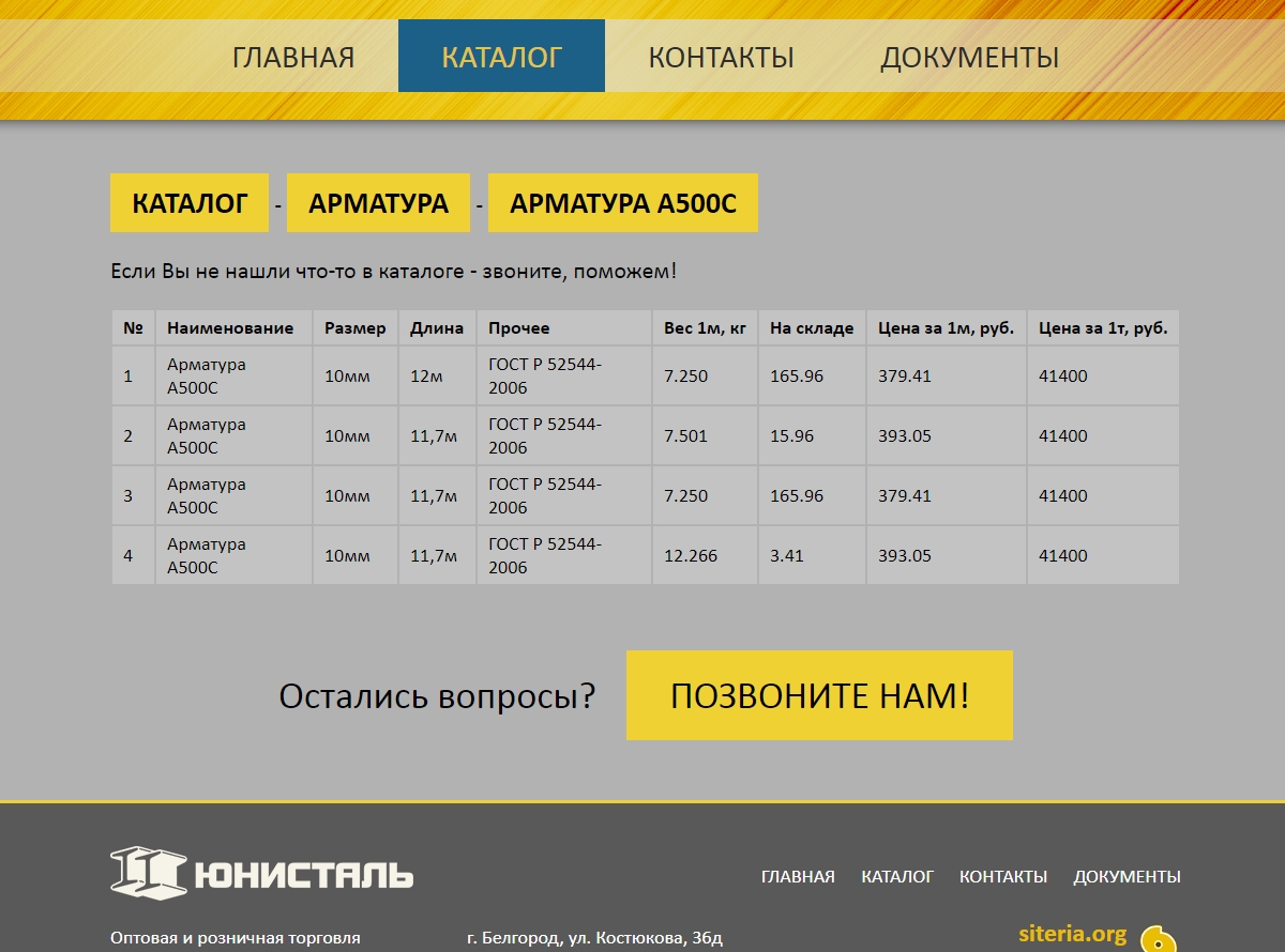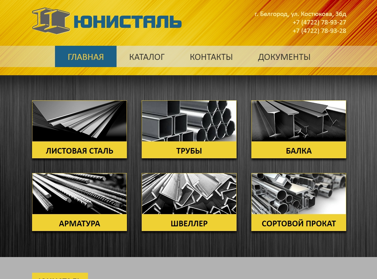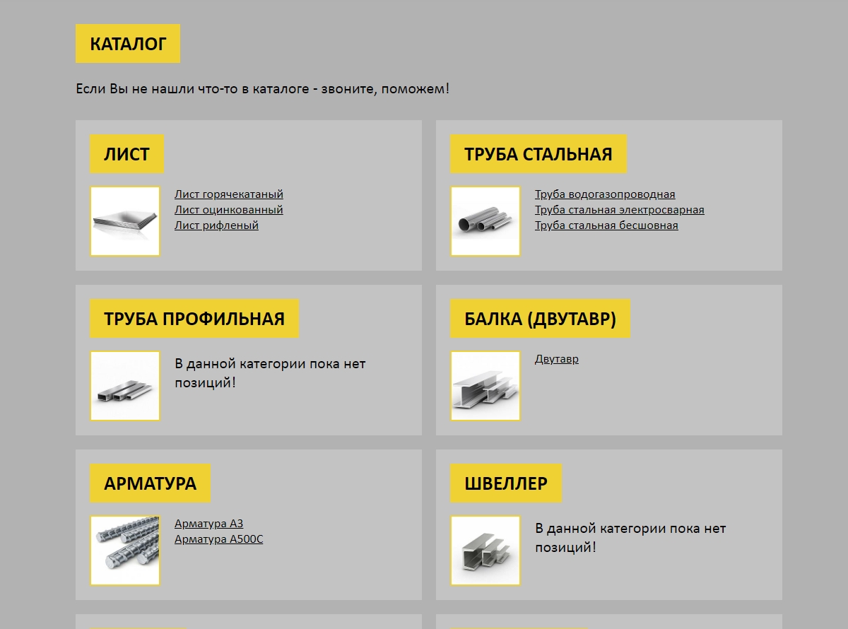Необходимо было создать сайт для торговой компании, специализирующейся на оптовой торговле металлом. На сайте представлены услуги компании, контактная информация, а также наполняемый каталог продукции.
