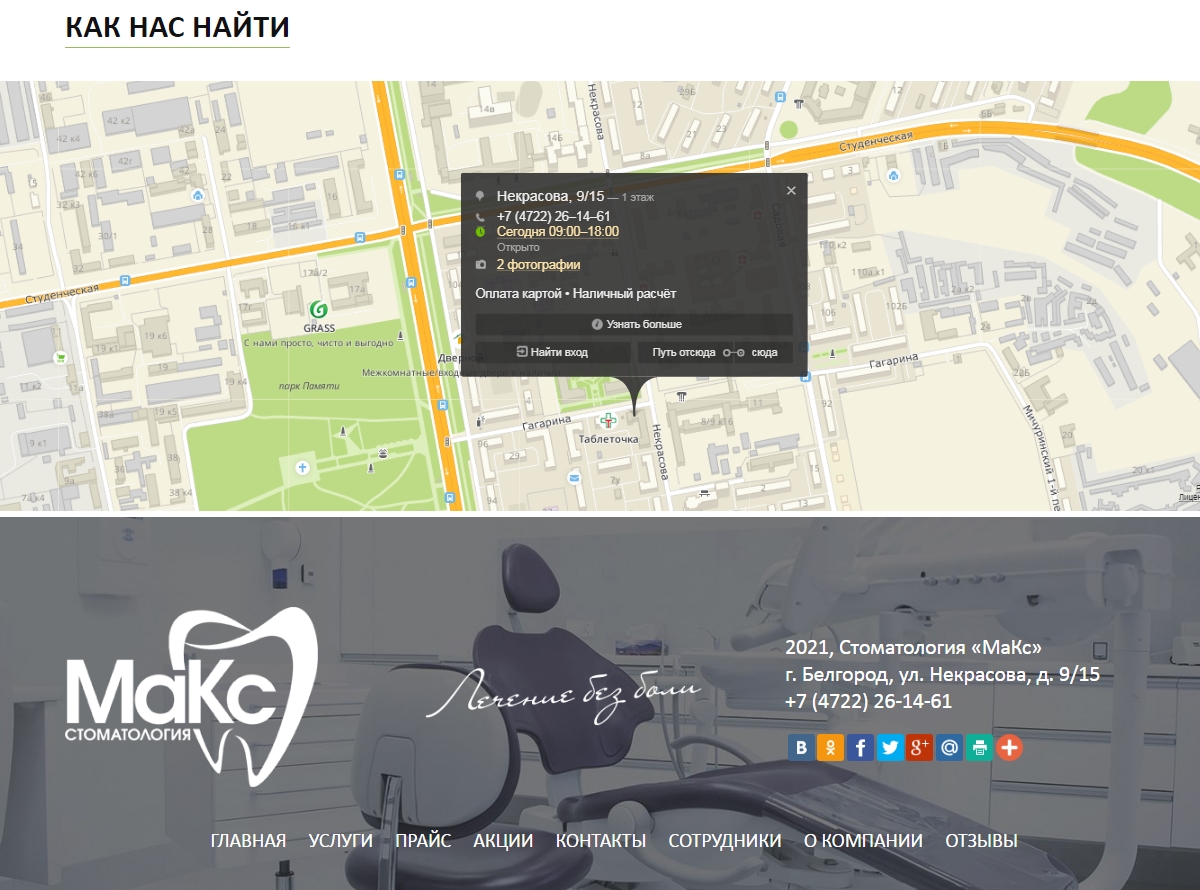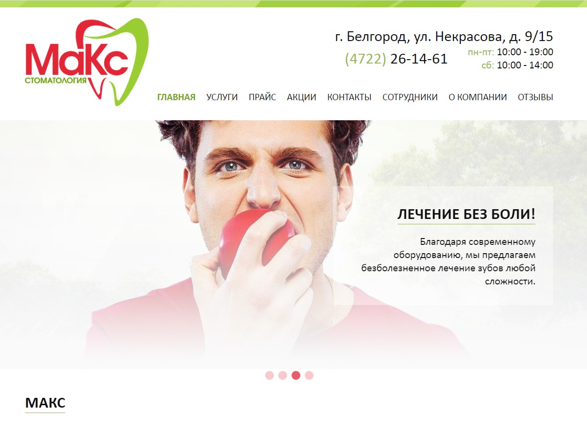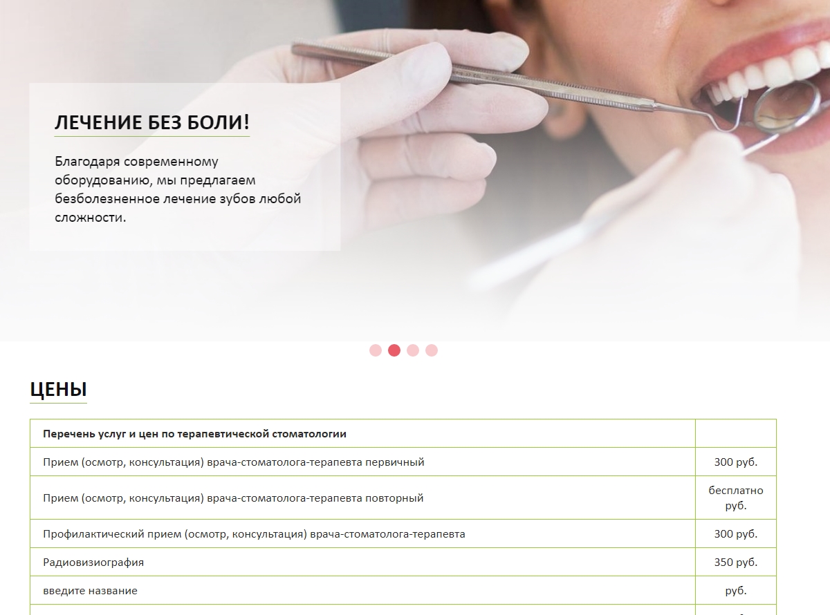 Необходимо было разработать сайт для стоматологической клиники. Сайт управляется через панель администрирования. Присутствует страница отзывов, редактируемая таблица стоимости услуг, а также обновляемая страница акций.