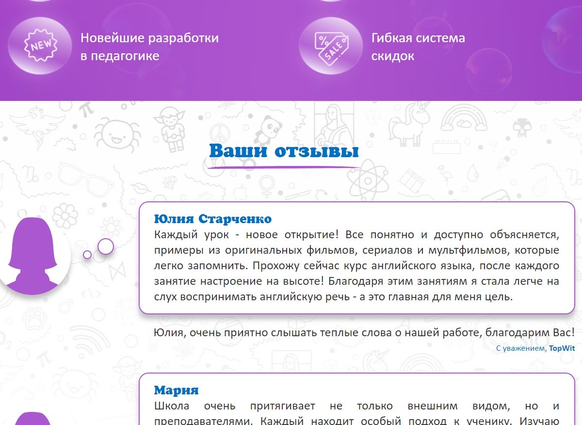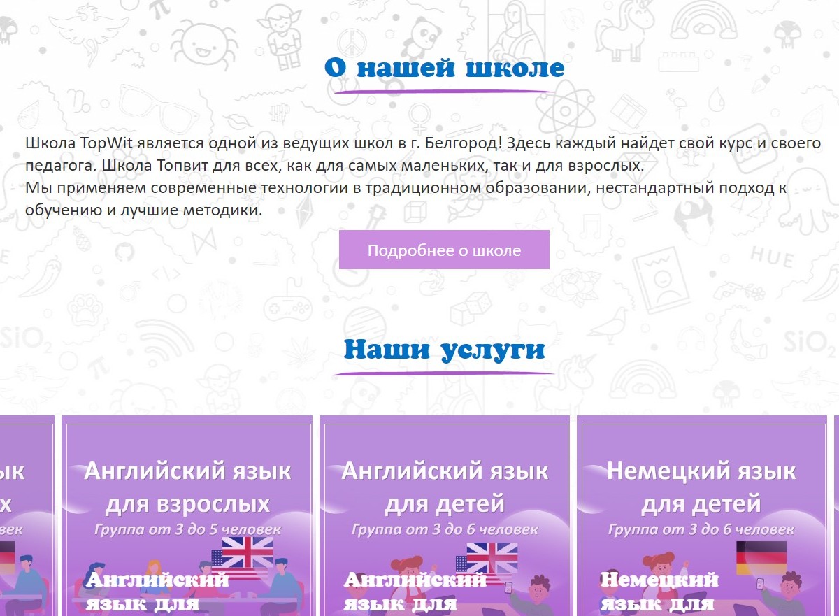 Создание сайта для частной школы. В функционал входит панель администрирования. Возможности - редактирование акций, таблицы стоимости услуг, обратная связь, отзывы с возможностью ответа, а также несколько слайдеров с возможностью редактирования через панель администрирования.